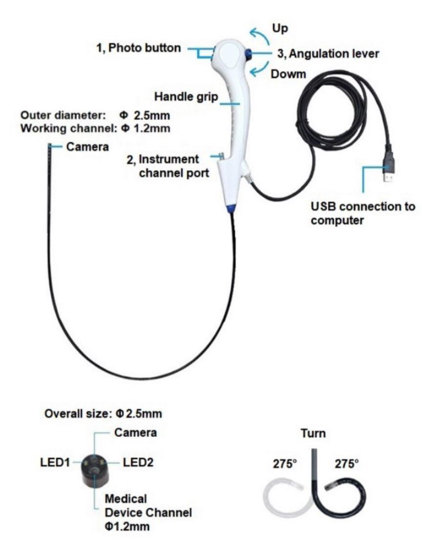 یورتروسکوپ فلکسیبل چند بار مصرف قابلیت اتصال از طریق USB به کامپیوتر و موبایل . قطر خارجی کاری: ۲.۵ میلیمتر کانال ابزار (Instrument channel): ۱.۲ میلیمتر طول کاری: ۶۵۰ میلیمتر طول سیم اتصال: ۲.۲ متر